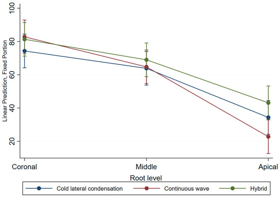 To study the impact of possible interaction between condensation techniques and the root level on the sealer penetration, the corresponding interaction terms were included in the model (Table 3, model 2). A significant difference was observed in the apical third, indicating a higher percentage of sealant penetration in the hybrid compared with the continuous wave technique (−20.1, 95% CI (−35.6, −4.5), p = 0.011). Figure 4 depicts the percentage of penetration in each technique across root levels. A lack of parallelism is observed, indicating the interaction between the compaction technique and the root level. The predicted values appear to be close at the coronal and middle root levels; however, in the apical section differences between techniques were observed the continuous wave had the lowest percentage penetration results (p < 0.05).