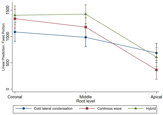Figure 5 depicts the maximum depth of sealer penetration for each technique across the root level, and an interaction between the technique and the root level is observed. The predicted values of sealer penetration in the coronal third of hybrid and continuous wave are close to each other, and cold lateral condensation shows lower results, while in the apical third this relationship changes and continuous wave has the lowest penetration value.