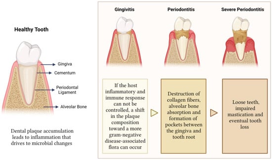 Periodontal disease is a multifactorial disease in which pathogenic bacteria initiate the host immune response, leading to the destruction of the tissues surrounding and supporting the teeth, such as gingiva, periodontal ligament, alveolar bone, and cementum [1]. These four tissues are part of the periodontium, a supporting apparatus essential for the restoration and proper functioning of periodontal tissues (Figure 1) [2]. Apart from anchoring the teeth in their respective alveolar pockets, the periodontium also stabilizes them by distributing and absorbing masticatory forces, and it serves as a barrier against several pathogens [2]. Periodontal disease first manifests as gingivitis, a dental inflammation initiated by dental plaque accumulation and affected by the host response, which dictates the disease progression [3]. Although improvements in oral hygiene habits may reverse gingivitis, a lack of treatment can lead to periodontitis, which is characterized by the destruction of collagen fibers, alveolar bone absorption, and the formation of soft tissue pockets between the gingiva and tooth root. If not addressed properly, this disease can progress to severe periodontitis, causing loose teeth, impaired mastication, and eventual tooth loss [1] (Figure 1). The loss of teeth due to severe periodontitis may lead to alveolar bone atrophy, which may require important bone augmentation or a bone graft in order to perform correct implant-supported prosthodontics [4].