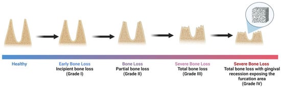 Bone loss triggered by periodontal disease. Bone grafts can be used to enhance the alveolar bone to accommodate an implant or to preserve the natural teeth in that defect, promoting new bone formation. Figure created using Biorender.com.