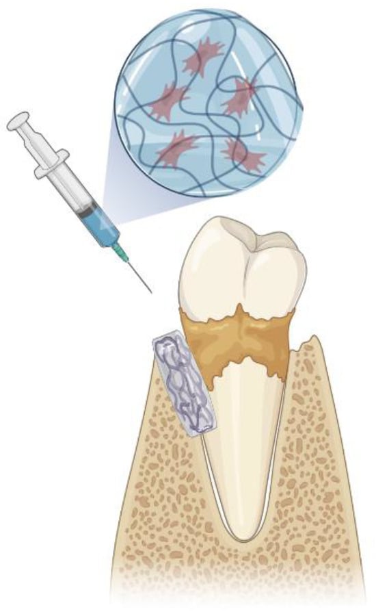 The ultimate goal of periodontal therapy is to achieve the regeneration of the alveolar bone, cementum, gingiva, and periodontal ligament. Thus, tissue engineering approaches have been evolving from simple membranes or grafts to more complex constructs. Hydrogels have shown interesting results for periodontal regeneration [29], since they can address one of the major limitations of current treatments: the inability to exert spatiotemporal control over the wound healing process [52]. In fact, hydrogels possess great advantages from a clinical perspective, such as injectability, easy accessibility, and their potential to deliver the necessary cues to induce the migration of the host cells and to accelerate periodontal tissue formation (Figure 4).