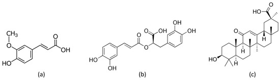 Molecular structure of (a) trans-ferulic acid (FA-H), (b) rosmarinic acid (RA-H), and (c) 18β-glycyrrhetinic acid (GA-H).
