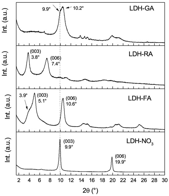 Three functional LDHs were synthesized by starting from LDH-NO3 and replacing nitrate anions with carboxylate anions derived from FA-H, RA-H, and GA-H compounds. For all three host-guest nanosystems, FT-IR analysis showed the presence of vibration signals characteristic of both the inorganic and organic constituents (Supplementary Material Figure S1), thus confirming the successful immobilization. Nonetheless, this analysis did not conclusively discern whether the anions were intercalated within the layers or merely adsorbed onto them. To delve into this aspect, the samples underwent characterization using XRD analysis to probe the potential expansion of the interlayer spacing caused by the insertion of organic molecules between the layers (Figure 2).