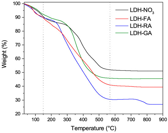 TGA thermograms of LDH-NO3, LDH-FA, LDH-RA, and LDH-GA.