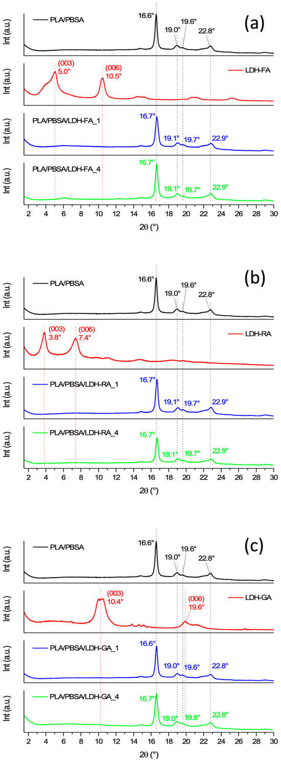 XRD patterns of LDH-FA, PLA/PBSA, PLA/PBSA/LDH-FA_1, PLA/PBSA/LDH-FA_4 (a), LDH-RA, PLA/PBSA, PLA/PBSA/LDH-RA_1, PLA/PBSA/LDH-RA_4 (b), LDH-GA, PLA/PBSA, PLA/PBSA/LDH-GA_1, PLA/PBSA/LDH-GA_4 (c).