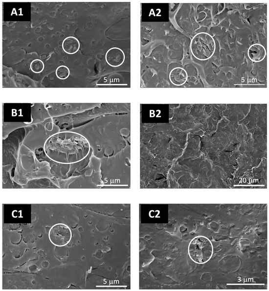 SEM micrographs (ETD detector) of PLA/PBSA/LDH-FA_1, PLA/PBSA/LDH-RA_1, and PLA/PBSA/LDH-GA_1 (A1,B1,C1), and of PLA/PBSA/LDH-FA_4, PLA/PBSA/LDH-RA_4, and PLA/PBSA/LDH-GA_4 (A2,B2,C2) at different magnifications. Microaggregates of LDH particles are indicated by the white circles.