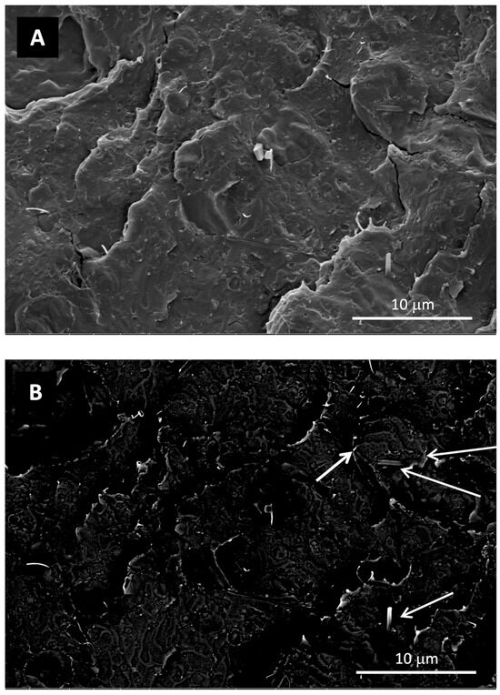 Comparison between SEM micrographs of the PLA/PBSA/LDH-GA_4 sample acquired at the same magnification and position using both secondary electrons (A) and backscattered electrons (B). The LDH nanoparticles are indicated by the white arrows.