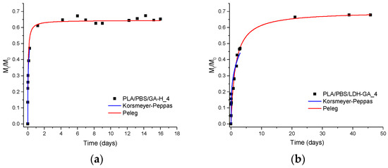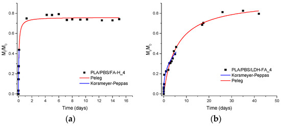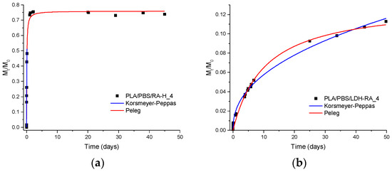 Migration studies that were carried out on samples containing 4 wt.% of modified LDH or free organic acids, and by fitting the experimental data with the Peleg and Korsmeyer–Peppas models, showed that the free organic acids mixed with the PLA/PBSA blend migrated faster and in a larger quantity than organic carboxylates immobilized in the modified LDHs and dispersed in the blend. Thus, the immobilization of bioactive compounds in LDH slowed their migration and guaranteed a prolonged composite activity. Furthermore, the analysis of Peleg’s and Korsmeyer–Peppas’s parameters demonstrated that the migration kinetics of active molecules depends on the immobilization mode in modified LDH. Indeed, RA, which was intercalated in LDH and ionically interacting with the lamellae, was slowly released from the composites. On the other hand, GA, which was only adsorbed on the surface of LDH lamellae, was released in the fastest way. The migration of FA deserves a different comment; indeed, we observed that ferulate anion, initially present in LDH-FA, degraded, probably to 4-VG, by a decarboxylation mechanism induced by high temperature during the mixing with the PLA/PBSA blend. Interestingly, 4-VG was intercalated but not bonded to LDH, not being an anion, and its migration ability was between the immobilized RA and adsorbed GA.