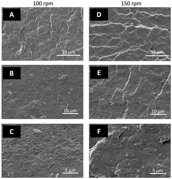 Coltelli et al. conducted a study on PLA/PBSA blends by varying the ratio of the two polymers [21]. They observed that as the amount of PBSA increased the material became more fluid and easier to process. Moreover, the biodegradability was improved [25]. Furthermore, it was observed that both elongation at break and impact resistance exhibited a notable enhancement with the increase in PBSA content from 5 to 40 wt.%. These changes were associated with a difference in the morphology of the blends from dispersed to co-continuous, as confirmed by scanning electron microscopy (SEM) analysis. Up to 20 wt.% PBSA, the blends had a dispersed phase within a continuous PLA matrix, indicating poor miscibility, while for the 60/40 composition, the morphology changed with the dispersed PBSA phase forming larger structures throughout the matrix [26].