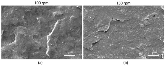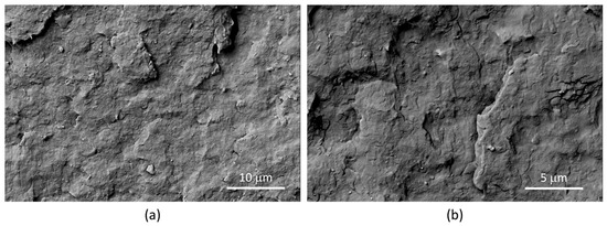 In composite materials, the morphology of the polymer matrix closely resembled that of the blend. Nevertheless, the separation between the two polymeric phases in the composites becomes less distinct than in the pure blend, suggesting the enhanced compatibility between PLA and PBSA (Figure 6). Regarding the dispersion of LDHs, SEM micrographs revealed the presence of micro-aggregates in all composite samples. These aggregates, marked by white circles in Figure 6, can be attributed to the diverse LDH types. However, micrographs obtained from samples containing 4 wt.% of the LDH, utilizing the backscattered electron detector, revealed the presence of numerous submicron-sized particles that are uniformly dispersed within the polymer matrix (Figure 7). In these images, the prevalence of intense focal points, corresponding to LDH, contrasts against the polymer matrix’s dark backdrop, confirming the LDH’s presence in the composites.