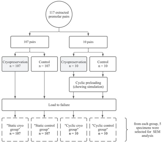 Figure 1 presents a schematic overview of the sample and test groups. A total of 234 intact premolars of 117 healthy children between the ages of 9 and 16, bilaterally extracted as part of orthodontic treatment, were included. For each child, one tooth was allocated to the cryopreservation group and the contralateral tooth was assigned to the (non-cryopreserved) control group. The study was approved by the Ethical Committee of Ghent University Hospital under the Belgian registration number GK2019-1238 and all participants signed a written informed consent form.