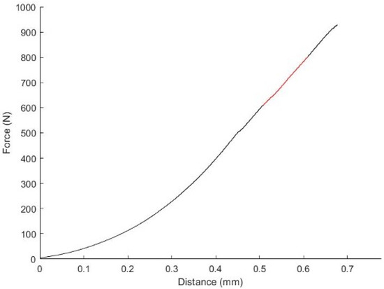 Force–distance diagram: the stiffness was calculated as the slope of the linear part of the force–distance curve before fracture, as indicated in red.