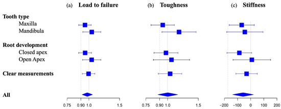 The estimated marginal mean toughness was identical in the cryopreservation and control group, i.e., 276 N·m (95% CI: 233–328). Hence, the difference in toughness between both groups (adjusted mean ratio = 1; 95% CI: 0.88–1.14; p = 0.968) is statistically insignificant as illustrated in Figure 3b. The non-inferiority assessment was borderline inconclusive in both the main analysis as well as the sensitivity analysis (including only the clear measurements), with lower limits of the 95% CI for the mean ratio of 0.88 and 0.89, respectively (less than NIM of 0.9). Subgroup analyses showed that the effect of cryopreservation on toughness was not different between subgroups according to tooth type (p = 0.120) or root development (p = 0.614).