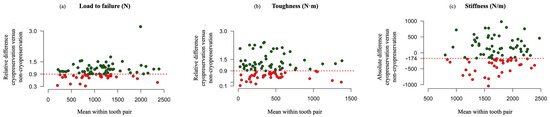 (a) Relative difference in cryopreservation versus non-cryopreservation in load to failure versus mean load to failure within each tooth pair. (b) Relative difference in cryopreservation versus non-cryopreservation in toughness (N·m) versus mean toughness within each tooth pair. The dotted red line represents the non-inferiority margin for the relative difference. (c) Absolute difference in cryopreservation versus non-cryopreservation in stiffness (N/m) versus mean stiffness within each tooth pair. The dotted red line represents the non-inferiority margin for the absolute difference.