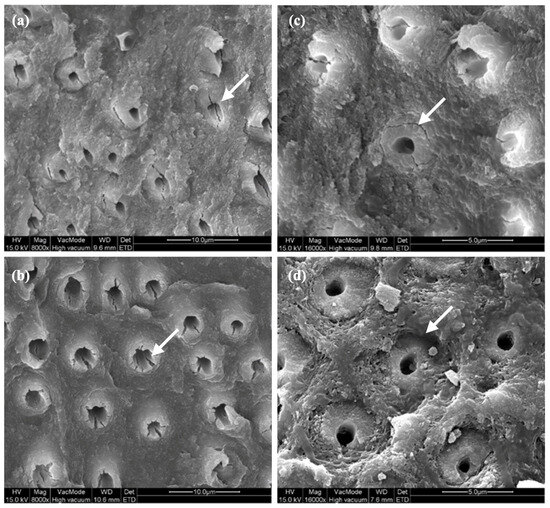 SEM images presenting peritubular cracks (a,b), a circular crack (c) or sunken peritubular dentin (d).