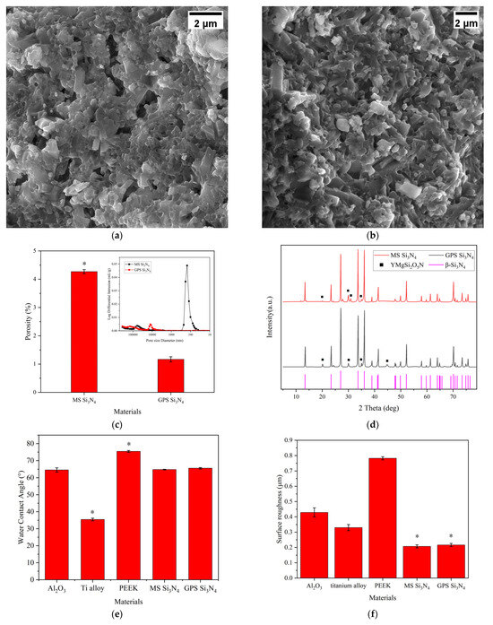 (a) SEM image of MS silicon nitride cross-section (magnification factor: 15.00 k×), (b) SEM image of GPS silicon nitride cross-section (magnification factor: 15.00 k×), (c) Porosity of silicon nitride samples (insert: pore size distribution of MS and GPS silicon nitride samples), (d) XRD pattern of silicon nitride samples, (e) Wettability of each material, (f) Surface roughness of each material (* p < 0.05).