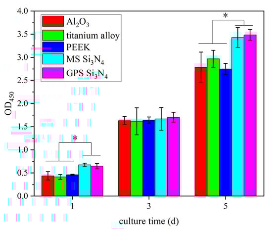 Figure 3 shows SEM photos of cells cultured on different materials. In Figure 3, it can be observed that cells can normally adhere to the surfaces of MS silicon nitride and other control materials. The surface of each material is partially covered by cells. The prominent filamentous pseudopodia on the surfaces of silicon nitrides, PEEK, and alumina ceramic are more pronounced, and the cells exhibit typical spindle or irregular shapes. On the contrary, the cells on the surface of titanium alloys are mainly circular. The adhesion of cells on the surface of MS silicon nitride is consistent with that on GPS silicon nitride.