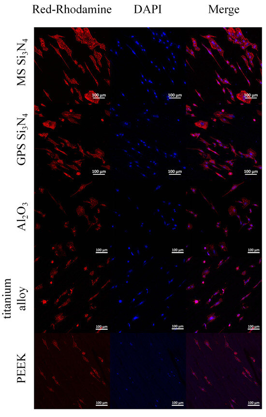 MC3T3-E1 cells attached to the sample were stained using DAPI and Actin Tracker Red Rhodamine and observed using a confocal laser scanning microscope. The results are shown in Figure 4. The effects of different samples on the morphology of the cytoskeleton were observed. The nuclei are blue and the microfilaments are red. Figure 4 shows the cytoskeleton of MS and GPS silicon nitride. It can be clearly observed that there are more nuclei on the surface of both types of silicon nitride. The adhesion of cells on MS silicon nitride is relatively consistent with that on GPS silicon nitride. There are a large number of actin microfilaments in each cell, forming well-shaped and evenly distributed cytoskeletons. Moreover, the cells on MS silicon nitride undergo significant cross-linking through the cytoskeletons.