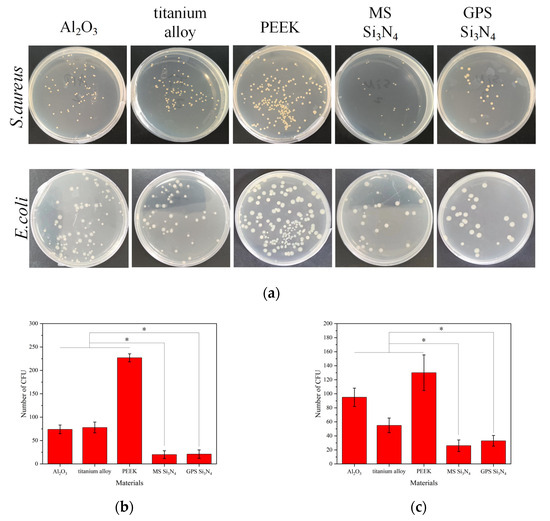 The main reason for inflammation around an implant is bacterial colonization on the surface of the implant, leading to bacterial infection. The use of antibiotics is a commonly used treatment method, and in severe cases, the implant needs to be removed. The ideal implant material should be able to resist bacterial adhesion and proliferation on its surface. Figure 5a shows the cultivation of S. aureus and E. coli on agar plates after being inoculated on the material and eluted. After inoculation, S. aureus and E. coli had the highest number of colonies on PEEK culture plates and the lowest number of colonies on the two types of silicon nitride culture plates. The colony-forming units of S. aureus on alumina ceramic, titanium alloy, PEEK, GPS silicon nitride, and MS silicon nitride were 74 ± 9.3, 78 ± 11.5, 227 ± 8.6, 20 ± 8.4, and 21 ± 9.1. The colony-forming units of E. coli on alumina ceramic, titanium alloy, PEEK, GPS silicon nitride, and MS silicon nitride were 95 ± 13.1, 55 ± 10.4, 130 ± 25.5, 26 ± 8.2, and 33 ± 7.6. The statistics on the number of colony-forming units are shown in Figure 5b,c. The colony counts of MS silicon nitride and GPS silicon nitride were significantly lower than those of other control materials. In Figure 5b,c, * indicates significance (p < 0.05).