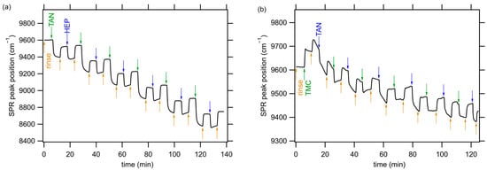 The significant changes observed in the SPR absorption peak during PEM assembly confirm the LbL PEM assembly. Notably, TAN demonstrated the potential to function as both a negatively and positively charged component in PEM structures, with the adjustment of solution pH. Moreover, the thickness of the adsorbed PEMs depends on the specific polyanion–polycation pairs used and can vary due to the interactions between strong and weak polyelectrolyte combinations []. Previous investigations from our research group have demonstrated that polysaccharide-based PEMs formed under these conditions are remarkably thin, measuring only a few nanometers []. For the TAN-HEP PEM, the SPR peak position exhibits a relatively large change following TAN deposition (>300 cm−1, for layers following the first layer), compared to the change associated with HEP deposition (>100 cm−1). This discrepancy can be attributed to the differences in molecular weight and charge density of the polymers, which result in different adsorption profiles. TAN has a significantly higher molecular weight and likely adsorbs in a coiled conformation, whereas HEP has a much lower molecular weight and has higher charge density imparted by many sulfate groups; it adopts a more extended conformation in solution [].