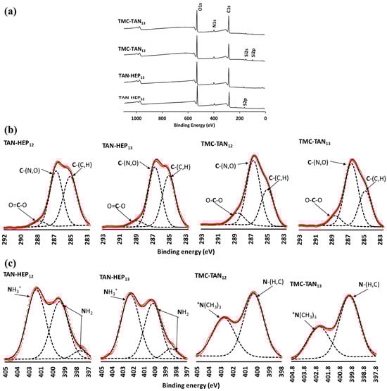 The XPS analysis confirmed the surface compositions of all TAN-containing PEMs (Figure 3 and Figure S3 in the supporting information). Survey scans of TAN-HEP and TMC-TAN with different terminated layers are shown in Figure 3, and the survey scans of PEI-TAN, TAN-CS, and TAN-HA PEMs are shown in Figure S3 in the supporting information. The obtained XPS spectra revealed distinct characteristic peaks corresponding to carbon (C1s) at 284 eV, oxygen (O1s) at 530 eV, nitrogen (N1s) at 400 eV, sulfur (S2p) at 167 eV, and silicon (Si2p) at 102 eV (Figure 3a). The absence of a detectable silicon peak confirms the complete coating of the substrate using TAN-HEP PEMs. However, a slight detection of the Si peak in TMC-TAN PEMs indicates a thinner coating. As expected, all surfaces modified with PEMs exhibit N1s peaks, which are characteristic of the composition of the polyelectrolytes. The N1s peak can be attributed to TAN and TMC in the PEM coatings because TMC contains N-methylated and N-acetylated glucosamine residues, and TAN contains amine groups. The N1s peak intensity shows an increase in the PEMs terminated with these polymers, whereas in the PEMs terminated with HEP, there is a notably higher intensity in the sulfur (S2p) peak.