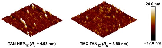 Various factors, including the structure of ionic polymers, polymer concentration, molar mass, surface polarity, and PEM composition influence the surface topography of PEMs. Earlier studies have highlighted that weakly charged polyelectrolytes, like chitosan, tend to adopt a coiled conformation, leading to rougher surfaces []. Da Câmara et al. [] reported that the TAN-CS PEM surface displayed relatively higher roughness than the TAN-HEP PEMs, as HEP contains more sulfated groups, contributing to its higher charge density.