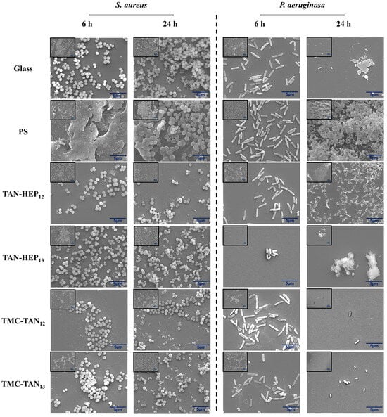 SEM images of the TAN-HEP and TMC-TAN PEMs with different terminated layers incubated with S. aureus and P. aeruginosa after 6 h and 24 h at 37 °C. Glass and PS were considered controls. Original magnification is 5000×, and 1000× (inset). SEM images of S. aureus and P. aeruginosa after 6 h and 24 h on TAN-HA, TAN-CS, and PEI-TAN surfaces are shown in Figure S7 in the supporting information.