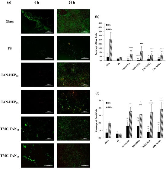 Figure 7, Figure 8 and Figure S8 in the supporting information present fluorescence microscopy images and the corresponding percentage coverage of live and dead S. aureus and P. aeruginosa bacteria on the surfaces coated with PEMs at 6 h and 24 h, respectively. In general, there was a higher adhesion of S. aureus bacteria observed on all PEMs compared to P. aeruginosa. Despite this higher adhesion, a significant number of the S. aureus bacteria attached to the PEM-coated surfaces were stained red, indicating that they were dead after 24 h of growth (Figure 7a). The PEMs had significantly more dead S. aureus after 24 h than either of the controls and significantly fewer live S. aureus after 24 h than the glass control. Notably, the biofilm observed in the SEM image in Figure 6 for the S. aureus on PS after 6 h may have prevented the cells in the biofilm from taking up the live and dead cell stains (Figure 7a). Therefore, it is important to interpret the fluorescence microscopy based on what is also observed in the SEM. No significant difference was observed among the PEMs in terms of their composition and terminated layer regarding the percentage of live and dead S. aureus bacteria (Figure 7b,c).