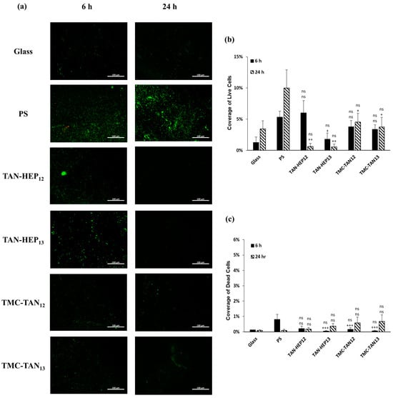 (a) Fluorescence microscopy images of P. aeruginosa on the PEMs. Live bacteria are represented in green (SYTO 9 stain) and dead bacteria in red (propidium iodide stain). Percentage of coverage for (b) live and (c) dead P. aeruginosa adhered to the surfaces. Glass and PS were considered as controls. “ns” p ≥ 0.05 compared to glass control at same time point; +++ p ≤ 0.001, ++ p ≤ 0.01, + p ≤ 0.05, and “ns” p ≥ 0.05 compared to PS control at same time point. Fluorescence microscopy images of P. aeruginosa on the TAN-HA, TAN-CS, and PEI-TAN PEMs are shown in Figure S8 in the supporting information.