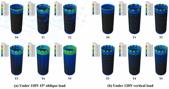 (a) The stress nephograms of T0–T5 models under a vertical load of 120 N. (b) The stress nephograms of T0–T5 models under an oblique load of 118.2 N. The equivalent stress values in the gray area are all greater than 40 MPa, and the equivalent stress values in the black area are all less than 1.6 MPa. The equivalent stress value gradually increases from the blue to the red area.