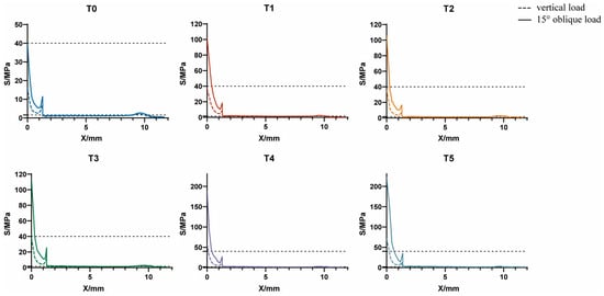 The stress nephograms of T0–T5 models under a vertical load of 120 N and an oblique load of 118.2 N are shown in Figure 2, and the axial variation trend of equivalent stress values is presented in Figure 3. The results were as follows: (1) Nodes with S ≥ 40 MPa were mainly distributed in the alveolar ridge margin, while nodes with S < 1.6 MPa were mainly distributed in the cancellous bone region. (2) Fault stress occurred at the junction of the cortical bone and cancellous bone. (3) The peak value of equivalent stress at the cortical bone margin (X = 0 mm) increased with an increase in the porosity of HP implants.