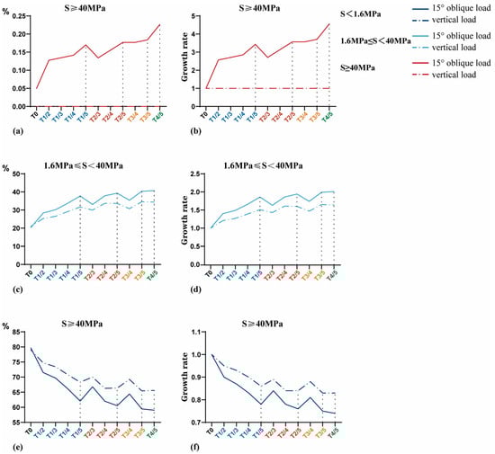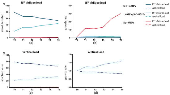 The results of the interval distribution of equivalent stress are shown in Table 4. The area of S < 1.6 MPa at the BII decreased gradually with an increase in porosity, while the area of 1.6 MPa ≤ S < 40 MPa and S ≥ 40 MPa increased gradually. From the absolute value perspective, the proportion of nodes whose stress value was within 1.6 MPa ≤ S < 40 MPa increased significantly, whereas the proportion of nodes whose S ≥ 40 MPa increased significantly from the growth rate perspective (Figure 4). The growth rate is equal to , i = 1, 2, 3, 4, 5. It should be noted that, under a 120 N vertical load, the number of nodes whose S ≥ 40 MPa in the T0 model is zero (i.e., the denominator is zero). Since the growth rate cannot be calculated in this case, it is ignored in Figure 4d.