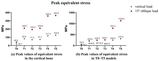 (a) Peak values of equivalent stress in the cortical bone; (b) Peak values of equivalent stress in T0–T5 models.