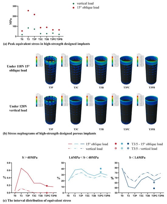 The stress nephograms of the five high-strength designed implants are shown in Figure 6b, and the interval distribution of equivalent stress is presented in Table 5 and Figure 6c. The results showed that under a 118.2 N oblique and 120 N vertical load, the distribution area of the T3PC model within the optimal stress interval of 1.6 MPa ≤ S < 40 MPa was 32.67% and 28.39%, respectively, second only to the T3P model. Meanwhile, under a 118.2 N oblique load, the distribution area of S ≥ 40 MPa in the T3PC model was 0.18%, which was only 1/3 of T3P, and the distribution area of S ≥ 40 MPa in the T3PC model was 0% under a vertical load of 120 N. Therefore, the equivalent stress distribution of the T3PC model was the best at the BII among the five high-strength designed porous implants.