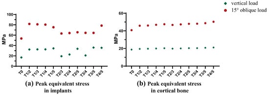 (a) Peak equivalent stress in implants; (b) Peak equivalent stress in cortical.