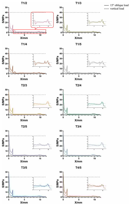 In the clinical application of dental implants, intraosseous stress must be maintained within a certain range to ensure physiological balance. Excessive stress can cause bone resorption or fatigue destruction of the implant, and too little stress may lead to disuse atrophy of bone, resulting in bone defects [,,,]. According to the requirements of implant biomechanical compatibility, the more uniform and dispersed the intraosseous stress distribution is, the more conducive it is to promote the reconstruction of bone tissue around the implant. In contrast, if the stress distribution is too concentrated, the coordination between the implant and the surrounding bone becomes poor, which increases the risk of bone resorption [,].