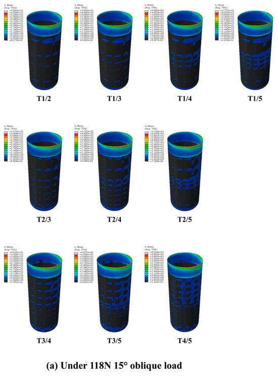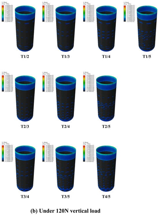 After a comprehensive analysis of the aforementioned data, we found that the area of 1.6 MPa ≤ S < 40 MPa in the T3 model was only slightly lower than that of T4 and T5; the area of S ≥ 40 MPa was significantly lower than that of T4 and T5 and was the same as that of T1 and T2. Meanwhile, the maximum equivalent stress value in T3 was far below 483 MPa. Therefore, we chose the T3 model as the basis for follow-up research.