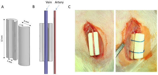 (A) Schematic diagram of scaffold geometry and (B) positioning of the vein axially within implant. (C) Photographs of the surgical procedure showing stages in scaffold assembly.