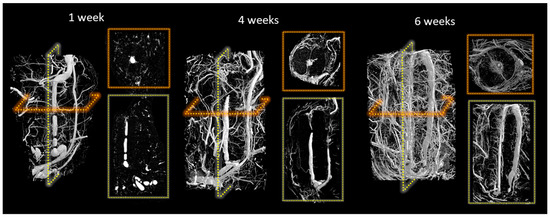 After 1, 2, 4, and 6 weeks of implantation, the animals were sacrificed and perfused with contrast agent, which polymerized inside their vascular network. The heart was exposed by opening the ribcage. Heparinized PBS (150 mL) followed by 4% paraformaldehyde (150 mL) was injected into the left ventricle by gravity flow via a perfusion bag set with an 18G needle. A small incision in the right atrium allowed exsanguination. Yellow Microfil (MV-122, Flowtech, CO, USA) injection was performed in the descending aorta and stopped when the fluid reached the heart through the right atrium. The descending aorta and inferior vena cava were then ligated, and the Microfil was allowed to harden overnight in the refrigerator at 4 °C. Finally, explants were harvested and placed in 4% PFA for 12 h, rinsed with PBS, and stored in 70% ethanol.