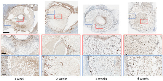 Of the several cell types found on the adventitia of veins, we sought to establish if smooth muscle cells were colonizing the microporosity inside the monetite. After 1 week, we found SMA-positive staining in the space between the central vein and the scaffold. After 2 weeks, isolated groups of SMA-expressing cells could be detected inside the scaffold, and by 4 weeks, these cells could be seen encircling small regions that appeared to be blood vessels throughout the cement thickness. The density of these cells then increased after 6 weeks, and in this sample, Microfil was present inside some of these structures (visible as black residue in Figure 3), confirming that these were indeed blood vessels.