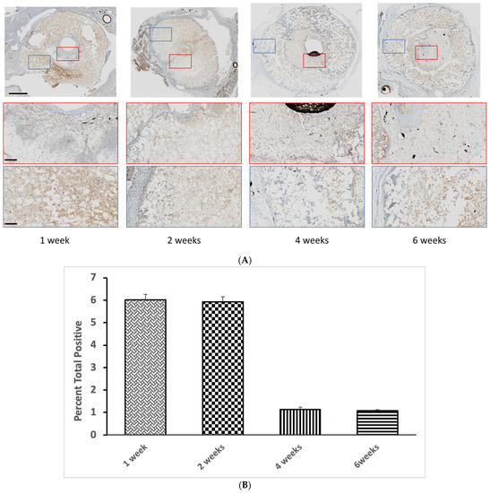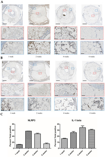 We suspected that crystals released from the cements may have activated the NLRP3 inflammasome, which would have resulted in an expression of IL-1β. We observed an increase in expression of NLRP3 after 2 weeks that became greatly reduced by 6 weeks. Expression of Il-1β appeared from the first week at the inner and outer surfaces of the cements and persisted for at least 6 weeks (Figure 6). The IHC was quantified using image analysis of the decalcified region (Figure 6C).