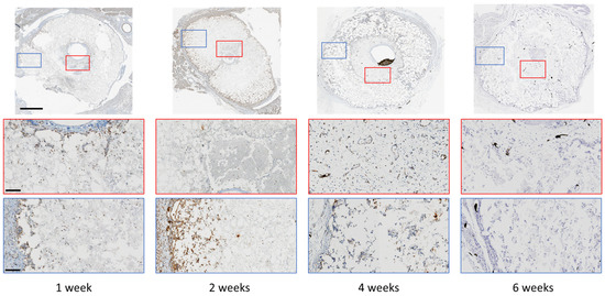 Decalcified immunohistochemistry (IHC) staining of F4/80-expressing cells at low and high magnification, outside and within the scaffold. The black material inside the vessels at 4 weeks is Microfil contrast agent. Scale bars on low and high magnification represent 1 mm and 400 µm, respectively.
