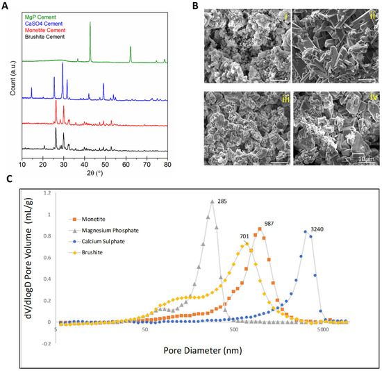 (A) X-ray diffraction patterns of the set cements after setting. (B) Scanning electron micrographs of fracture surfaces of (i) MgPO4, (ii) CaSO4, (iii) monetite, (iv) brushite. Calcium sulphate and brushite had similar microstructures whose cementitious matrix was made up of at least one population of platy crystals up to ~5 µm in dimension, whereas monetite and magnesium phosphate were more crystalline with rhomboid crystals >10 µm in dimension. (C) Mercury porosimetry showed the modal pore sizes lay in the range ¼ to 5 µm.