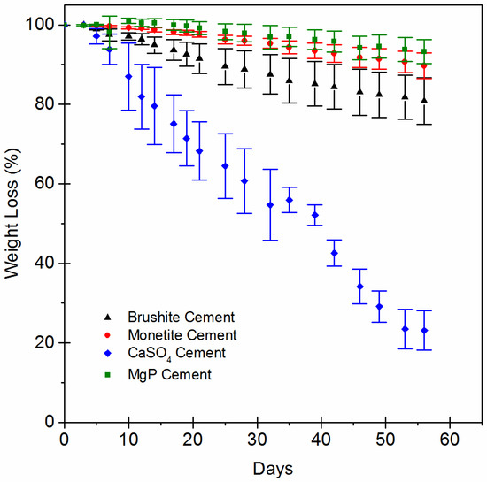 Results of weight loss of the four experimental materials used as scaffold in the present study: MgP, CaSO4, monetite, and brushite. The bars represent the standard deviation values for each measure (n = 5).
