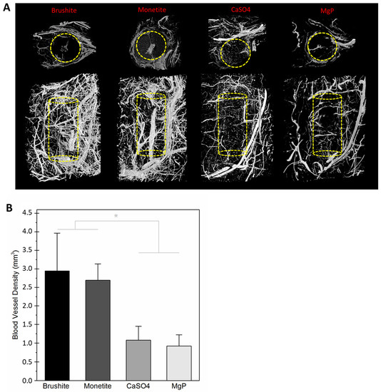 (A) Two-dimensional cross sections and 3D reconstructed images of vascular networks developed within and around scaffolds after 4 weeks of implantation, as shown by micro-CT. (B) Mean and standard deviation values of blood vessel density within scaffolds after 4 weeks of implantation (n = 4). There were neither statistically significant differences between brushite and monetite, nor between calcium sulphate and magnesium phosphate; however, these two groups were significantly different (* p < 0.05).