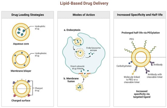 Polyethylene glycol-coated (PEGylated) lipids are one type of modified lipids in which a lipid moiety is attached to the polymer core, and a polyethylene glycol (PEG) chain extends outward into the surrounding aqueous medium. The mechanism may involve the creation of a bilayer structure and its adhesion to the core, followed by the bilayer’s breakdown due to hydrophobic interaction between the polymer and the lipid chains. The hybrid creation has a positive thermodynamic outcome regarding hydrophobic, van der Waal, and electrostatic interactions [].