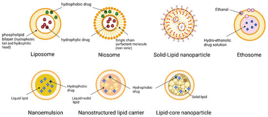 Vesicles having a size of 70 nm have been found to deliver the most molecules []. More and more research is being performed on LNPs, which, according to recent discoveries, are preferable to vesicular systems because they can reach deeper layers of the epidermis []. LNPs also allow biocompatible components approved for pharmaceutical and cosmetic use, molecules with varied solubility, improved skin diffusion by combining physical and mechanical enhancers, targeted delivery, and lower systemic side effects. A subset of LNPs known as solid nanoparticles (SLNs) offers an alternative to more conventional lipid-based formulations such as liposomes, niosomes, and emulsions []. The next generation of LNPs is nanostructured lipid carriers (NLCs). A more complex lipid matrix in NLCs, including liquid lipids (such as: oils), generates changes in the structure of the SLNs, resulting in a less ordered crystalline arrangement that prevents drug leakage and supplies a higher drug load []. This contrasts with SLNs, which consist entirely of solid lipids and a perfectly smooth matrix. Factors such as the LNPs’ size also play a role in determining the distribution mechanism. Particles smaller than 10 nm can easily break through the stratum corneum of healthy human skin, while particles between 10 nm and 200 nm can enter the skin via the hair follicles [,]. Furthermore, the LNPs physiological lipid composition improves drug permeability through rearrangement and fluidization of the stratum corneum lipid matrix. As a result of the occlusion they create, water loss is reduced, which in turn results in more hydrated skin. The schematic structure of LNCs is represented in Figure 2.