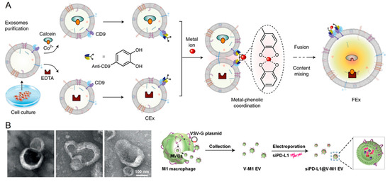 (A) Schematic showing the metal-triggered exosome fusion by making the supramolecular complex with the catechol-modified plasma membrane that brings the exosomes together. During this process, multiple reactants were encapsulated together and mixed inside the fused exosomes. Reproduced from Springer Nature [107]. (B) Transmission electron microscopic images and schematic presentation of the loading of siRNA into the EVs during fusion. Reproduced from Willey [108].