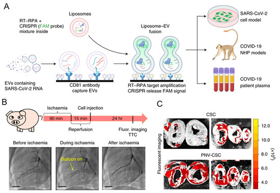 (A) Detection of SARS-CoV-2 RNA-positive EVs in plasma using the fusion method with liposomes. Reverse transcriptase–recombinase polymerase amplification-clustered regularly interspaced short palindromic repeat (RT-RPA-CRISPR)-loaded liposomes fuse with plasma EVs in the proposed assay’s schematic, which also shows target amplification by RT-RPA and signal production by the CRISPR-mediated cleavage of a quenched fluorescent probe in proportion to the target amplicon concentration. Cell culture media and plasma from COVID-19 patients and nonhuman primate (NHP) illness models serve as analysis sample types. Reproduced from Springer Nature [130]. (B,C) Heart injury repair by utilizing stem cells fused with platelet nanovesicles. This schematic shows the pig study design and the angiograms for coronary flow during the placement of a balloon before and after ischemia. Scale bar, 15 mm. Fluorescence imaging of ischemia/reperfusion pig hearts after the injection of platelet nanovesicles-decorated cardiac stem cells. Reproduced from Springer Nature [110].