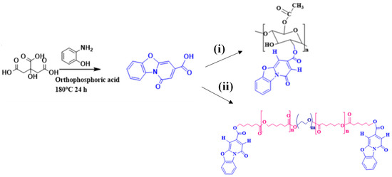 Synthesis of fluorescent dye PBC by the reaction of citric acid using precursor 2-Amino phenol. Molecular weights for PCL-PEG-PBC and CA-PBC are 11,849 and 55,853 respectively. Scheme (i): CA conjugated PBC with catalyst DCC and DMAP at 180 °C. Scheme (ii): PCL-PEG conjugated PBC with catalyst DCC and DMAP at 180 °C. DCC: N,N′-dicyclohexylcarbodiimide; DMAP: 4-dimethyl aminopyridine; DMF, dimethyl formamide. Nanoparticles of CA and PCL-PEG conjugated with a fluorescent dye were prepared by the oil-in-water emulsion technique to deliver high- and low-solubility 4-AP and IND drug molecules.
